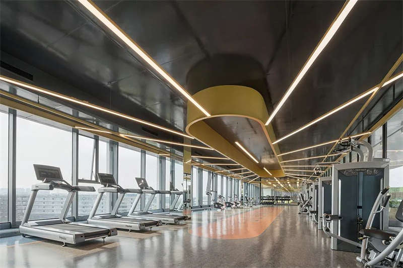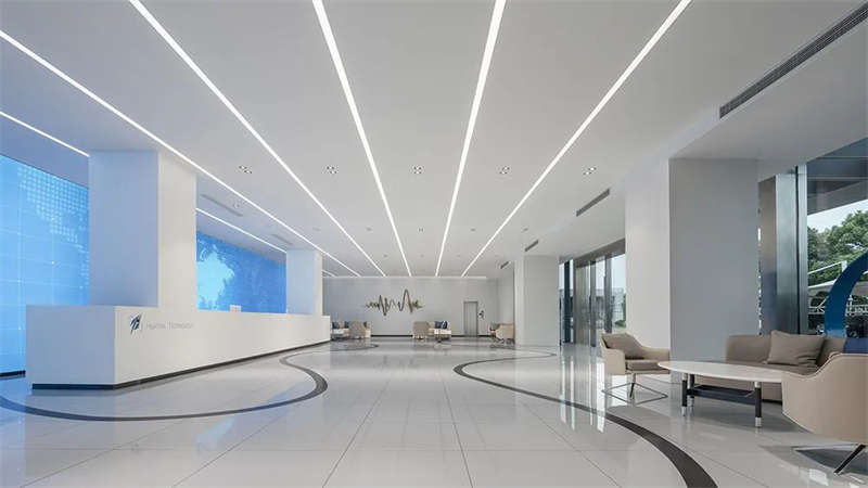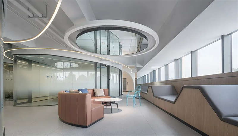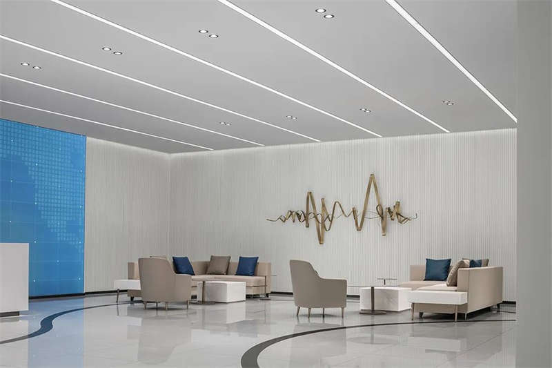 前廳頂部,鏡面質感與光帶反射,使空間得到延伸、重疊呼應,營造出多維的視覺效果,同時打破科技辦公室設計的刻板印象,擁有寬敞開放的前臺設計、待客區,層次、質感、豐滿而厚重。