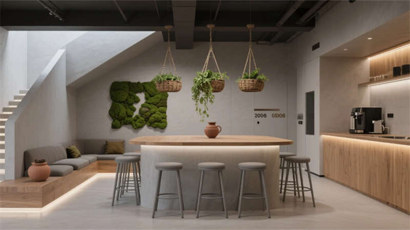 協作區域呈現有機張力:茶水間的階梯式布局激發非正式交流,可書寫玻璃環繞的頭腦風暴區釋放創造力,而模塊化沙發的灰綠色調呼應窗外城市綠景。多功能廳的折疊原木階梯與生態屏幕,在科技與自然間取得平衡。