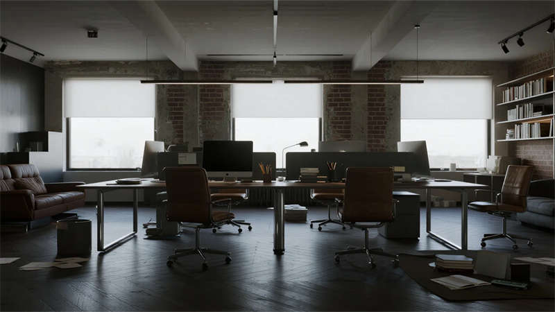 這組工業風辦公室設計以裸露結構和復古質感為核心,通過混凝土、金屬和木質材料的碰撞,打造出兼具實用性與藝術感的辦公空間。空間保留了建筑的原始肌理,如天花板的管線和墻面的磚紋,搭配黑色鐵藝家具和深色調軟裝,營造出冷峻而富有張力的氛圍。局部通過皮質沙發、綠植和暖光燈具軟化工業風的硬朗感,增添人文氣息。