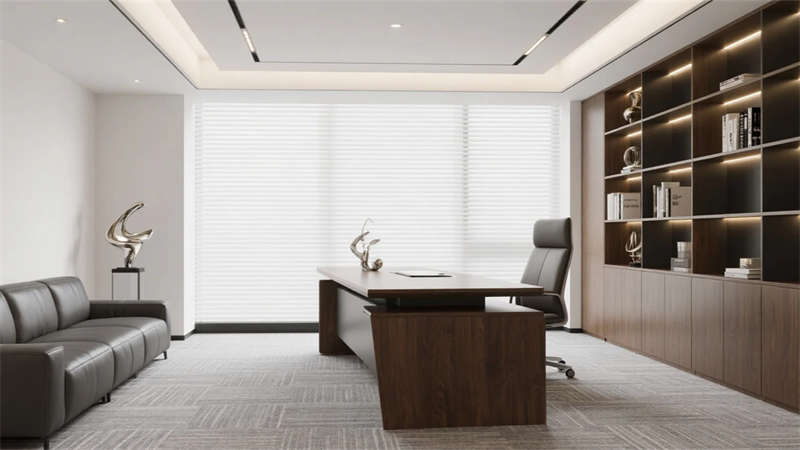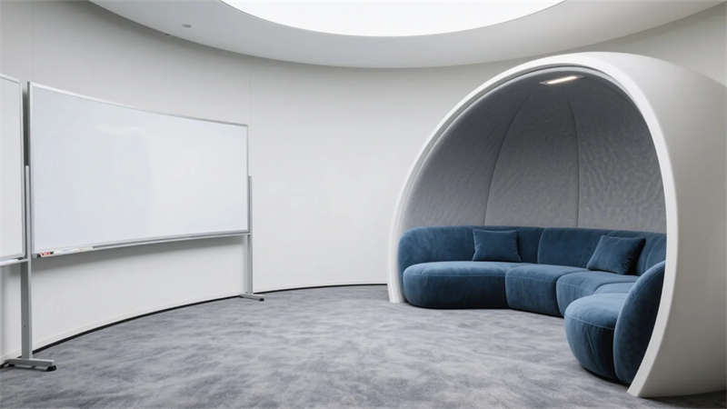 核心區(qū)域聚焦功能與美學的平衡:前臺木格柵墻以線性燈光延展空間縱深感;開放式工位區(qū)通過綠植與幾何畫作注入生機;獨立辦公室運用胡桃木與皮質元素提升質感,整墻書架成為智慧沉淀的象征。過渡空間被賦予多重價值——走廊生態(tài)墻引入自然呼吸,蛋形討論艙激發(fā)即興靈感,階梯圖書館則營造沉思角落。