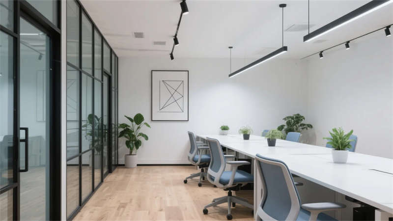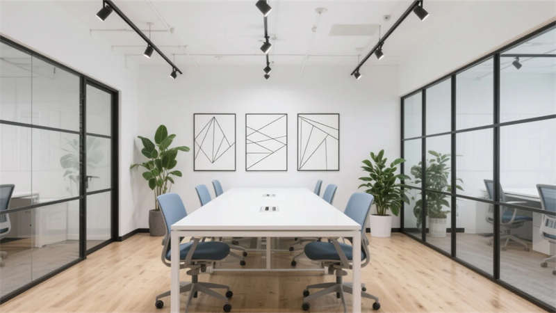 該辦公空間以現(xiàn)代簡約主義為基調,摒棄冗余裝飾,通過材質本真與光影韻律構建理性而溫潤的場域。開放式布局打破傳統(tǒng)隔閡,淺木色地板與純白立面奠定寧靜氛圍,黑色金屬框架勾勒結構張力,形成流動的視覺節(jié)奏。