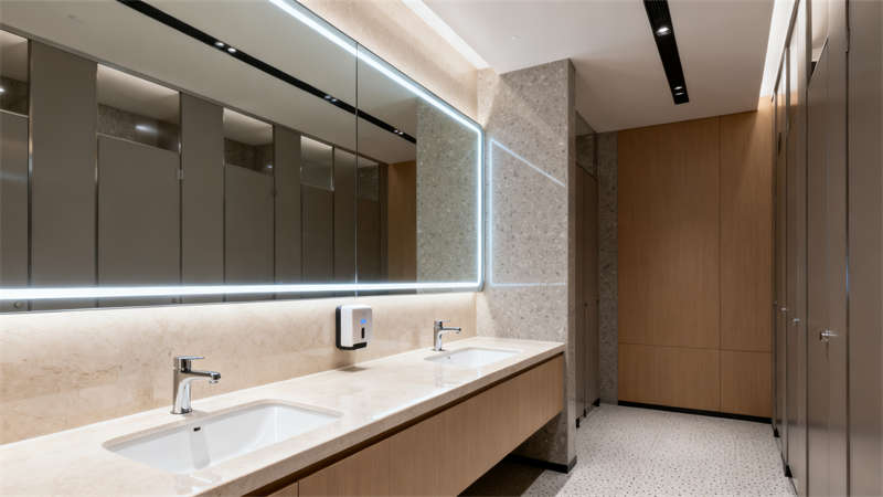 茶水間兼顧實用與休閑屬性,齊全的設備滿足日常需求,休閑桌椅的設置為員工提供放松空間。電梯廳延續整體簡約風格,大理石材質與裝飾畫、水晶吊燈的搭配,提升空間精致感,指示牌的清晰設置保障通行便捷。