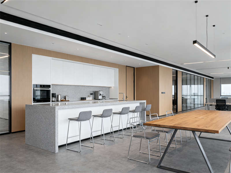 中型會議室圍繞協作功能展開,長條式會議桌與玻璃隔斷搭配,既保證空間開闊,又能與外部辦公區形成視覺聯動,灰色布藝座椅與頂部圓形吊燈呼應,讓會議場景兼具功能性與舒適感。茶水間則通過淺灰石英石臺面、木色護墻板與暖光燈帶,營造輕松休閑的氛圍,成為辦公間隙的放松節點。