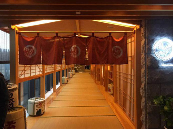 通常是門口有一個3段式,或者是4段式的暖簾,寫上自己的店名,中文日文,或者是其他,然后通向廚房的門口掛上一個暖簾。
