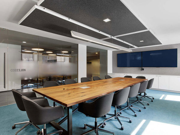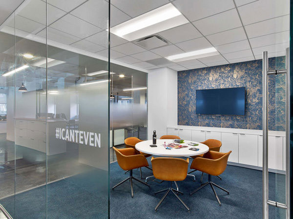 清朗凝練的空間更多了一份雍容典雅的都市氣質,依舊以藍色標志色為裝飾主調,只是這次的藍色更暗雅、更富于細膩的變化。極富質感的白蠟木材質與黑色碳鋼構件制作的家具,呈現出特有的都市氣質。閉合的洽談室和會議室大多聚集于空間的內部,以盡可能留出沿窗的空間令視線不被遮擋。連續而開敞的玻璃窗,讓室外城市美景盡收眼底,心情也變得豁然開朗。