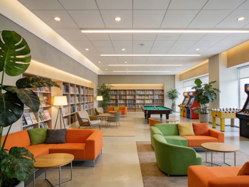 員工休息區充滿活力與溫馨,彩色的沙發錯落擺放,搭配綠植與休閑桌椅,為員工打造一個放松身心的舒適角落。還設置了小型的閱讀區與娛樂設施,豐富員工的業余生活。