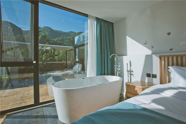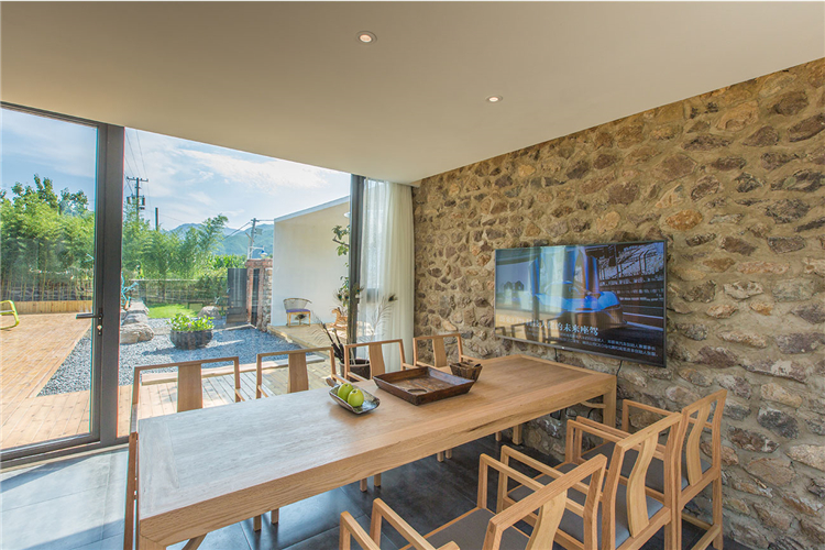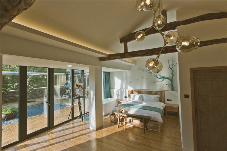“隨著越來越快的生活節(jié)奏我們每天奔忙,每天遺忘城市越來越近,鄉(xiāng)村卻越來越遠(yuǎn)”。這所名為“畫框里”的民宿位于水泉子村,而名字寓意為將百里畫廊的山水美景留在畫中院中。可看到名副其實(shí)靈動的山水畫這四季的變幻,凝集了我們對生活所有的向往。落地窗邊放置了浴缸做一個泡泡浴一眼望去是院落的美景和遠(yuǎn)山的意境。主臥空間很寬敞,新中式的原木配灰色的簡易家具些許的現(xiàn)代元素金屬攝影燈使房間內(nèi)多一份輕松感。