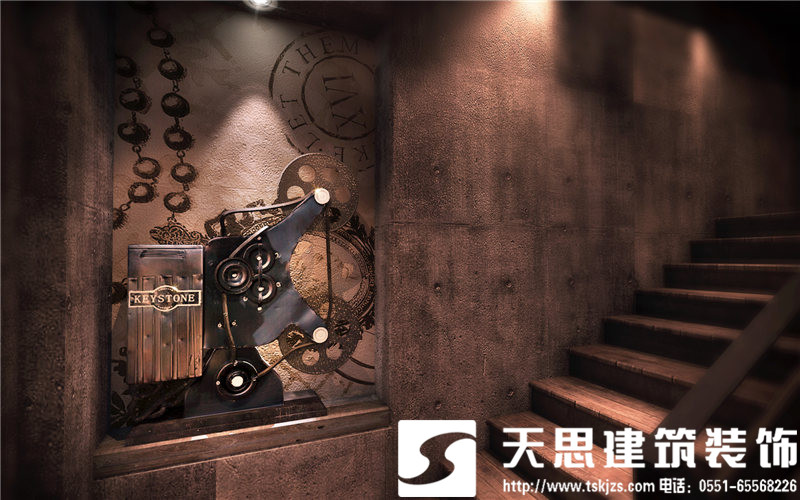 水晶燈飾自然垂掛在房間的邊角,各式桌椅隨意擺放,鋼木磚石與燈光渾然天成。信手繪制在墻面的齒輪充滿動感,拾階而上又將是另一番別有洞天。
