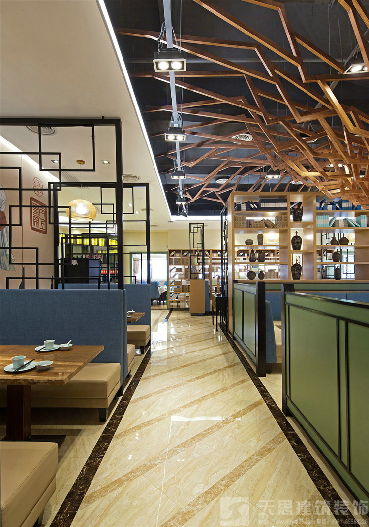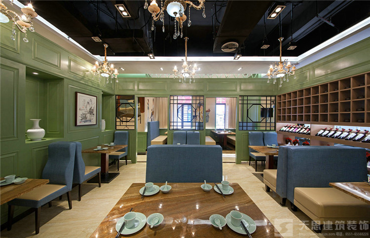 夜宴餐廳以五代十國時南唐畫家顧閎中的作品《韓熙載夜宴圖》為創作靈感來源,通過“聽彈琵琶”,“集體觀舞”,“中間休息”,“各自賞月”。“依依惜別”,等五個章節來還原當時的盛況,通過畫中設計元素提煉,及色彩的組合,達到客戶用餐的體驗感。
