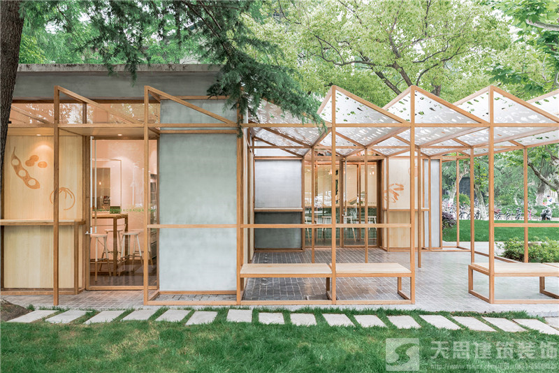 同樣運用木材和綠色系,再結合可愛的鏤空圖案棚架,打造出一個清新溫暖的包子鋪。尖角狀的溫室結構一直延展到室外空間,同時有兩面是被經過鏤空圖案效果設計的可滑動木面板所圍合。