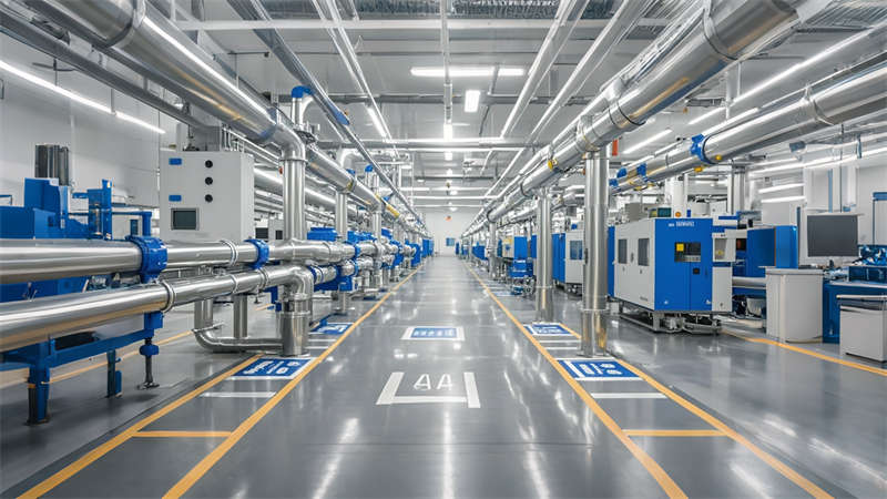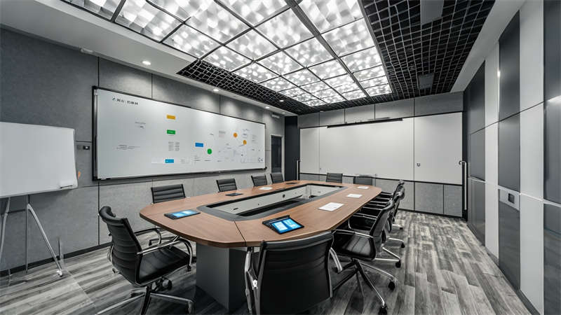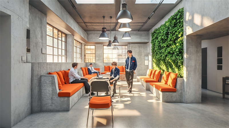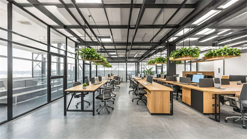 3) 色彩策略運用冷色調提升作業專注度,暖色點綴緩解視覺疲勞。材料選擇上,金屬格柵、清水混凝土與環氧地坪的搭配兼顧耐用性與美學表達,集成式 LED 照明系統實現能耗降低。該設計在滿足 ISO 生產標準的同時,通過人性化休息區與智能管理系統,打造現代制造業空間新標桿。