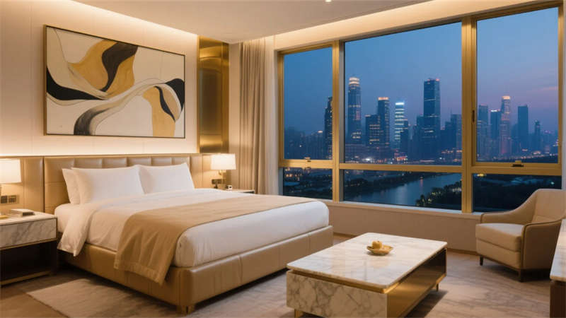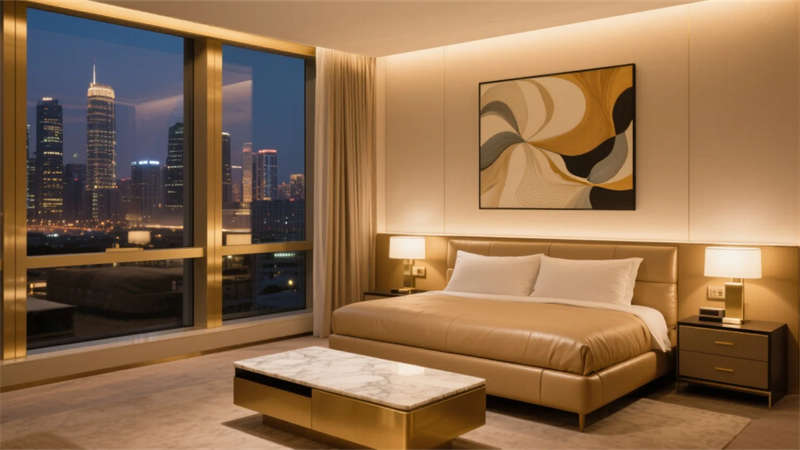 酒店以當代輕奢美學為靈魂,將精致質感融入每個空間肌理。淺金色金屬與溫潤大理石的碰撞,勾勒出低調奢華的氣質基底,暖灰中性色調營造舒緩靜謐的氛圍場域。落地玻璃幕墻引自然入室,琥珀色玻璃屏風與鎏金藝術裝置在光影交織中煥發靈動生機。
