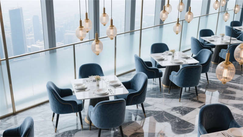空間敘事聚焦于質感細節:皮革與絨面織物溫柔包裹休憩區域,定制吊燈灑落琥珀光暈,抽象藝術畫作點綴留白墻面。從高空餐廳的云端食趣到套房浴室的蒸汽氤氳,從大堂茶歇的咖啡香氣到泳池區的波光瀲滟,設計以人性化尺度打造多重感官體驗。