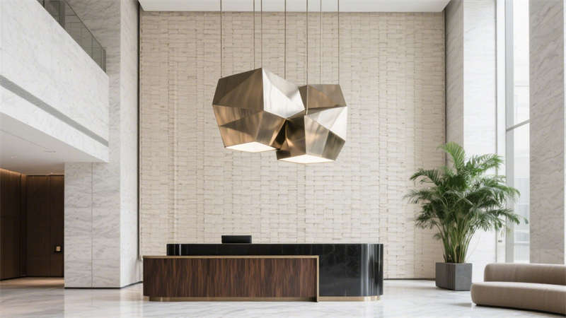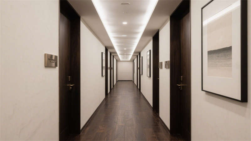 在公共區域,大堂以開闊通透的布局呈現,大面積的落地玻璃引入充足自然光線,讓空間更顯明亮通透。接待區選用柔軟的布藝沙發與金屬質感的裝飾擺件相搭配,既傳遞出溫馨的氛圍,又不失精致格調。走廊設計則注重引導性,墻面采用肌理感材質,搭配嵌入式燈光,營造出靜謐而優雅的行走體驗。