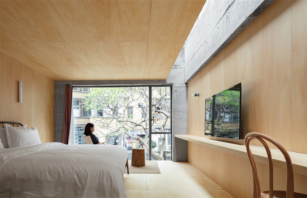 建筑四周圍繞著老式居民樓,為了使其呼應(yīng)周圍居住環(huán)境的氛圍,特意保留了原有立面具有歷史質(zhì)感的青磚。此外,在外立面的門窗的位置和進(jìn)深的設(shè)計上,結(jié)合整個建筑比例和室內(nèi)布局以數(shù)十厘米為單位進(jìn)行了微調(diào),使得室內(nèi)視野開敞且采光充足。金屬窗框的更換和進(jìn)深的加深則為民宿增添了空間浸入感。