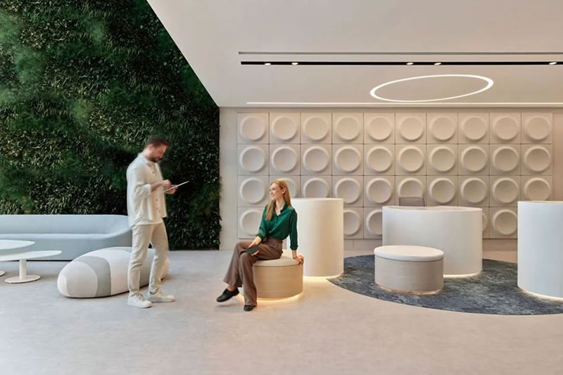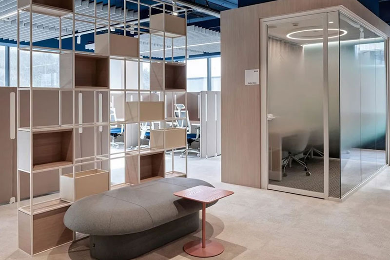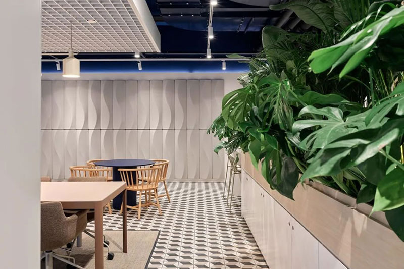 開放協(xié)作、動靜相容、靈活多元(寧靜的工作區(qū)、舒適的休閑區(qū)、開敞多元的社交區(qū)和協(xié)作區(qū)),建立在ABW基礎(chǔ)上的超強適應(yīng)性空間規(guī)劃支持人們多樣化的工作需求。簡約溫馨的配色,加以韻律感的元素重復(fù)應(yīng)用,以及隨處可見的大量綠色植物,讓整個空間在恬靜溫婉中又洋溢著靈動的韻致。