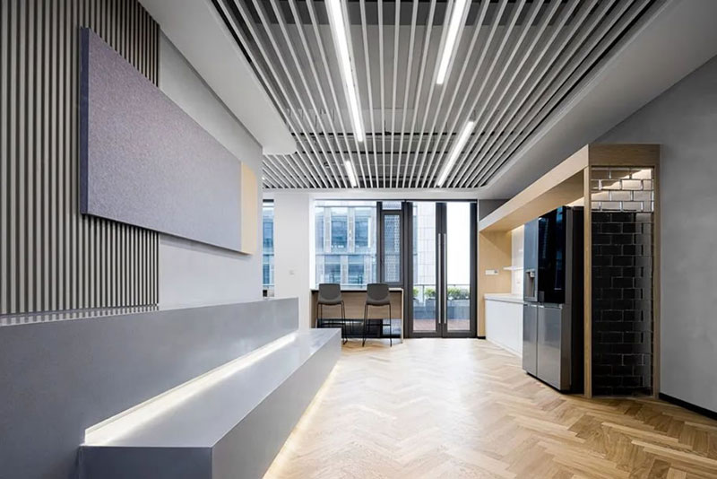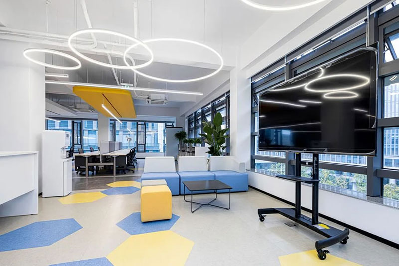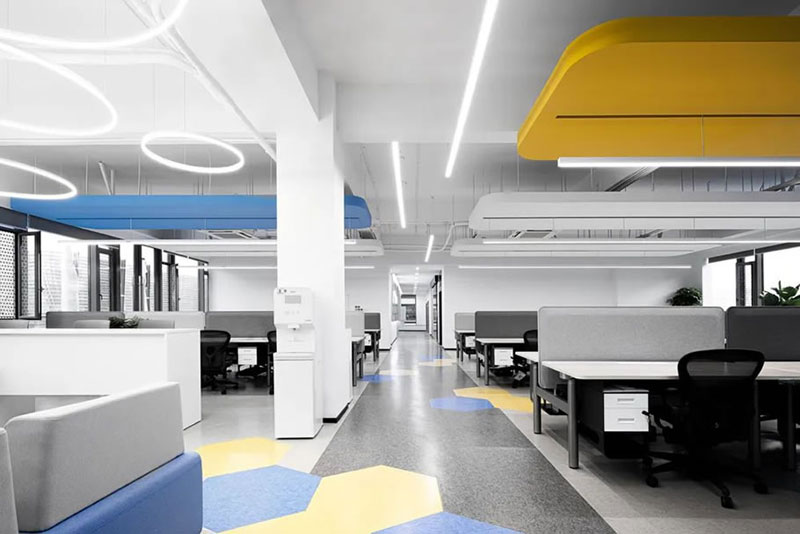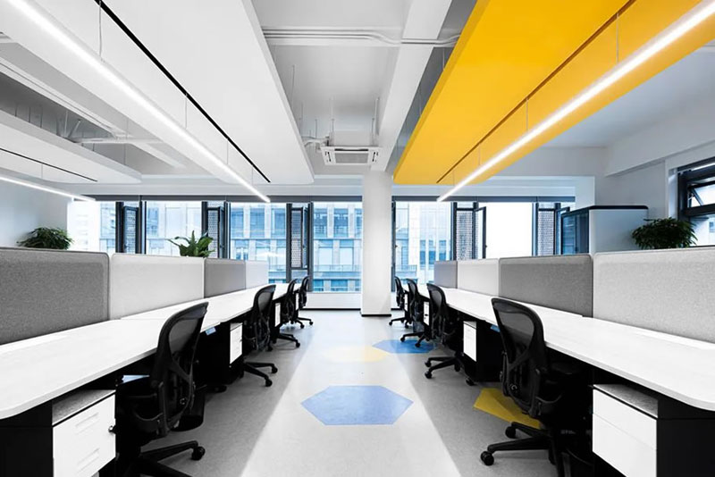 開放工位的造型吊頂與地面色塊相互呼應(yīng),輕松有趣的氣質(zhì)穿梭在人員協(xié)作之間,中性色彩辦公家具在細(xì)節(jié)上增加耐用和降低視覺刺激導(dǎo)致的疲勞感。真正舒適的空間做到與功能需求一致,提供給使用者專心的設(shè)施和敏捷的思路。
