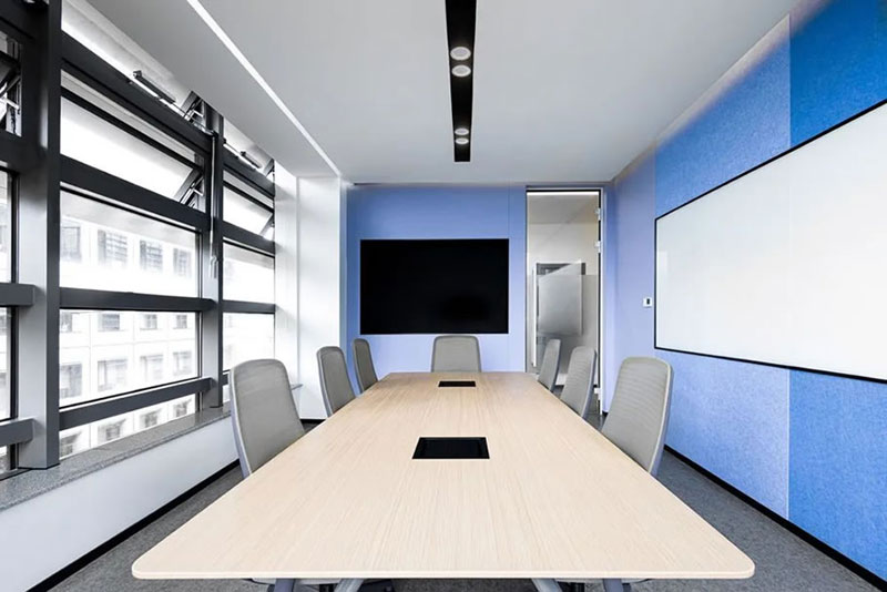 封閉會(huì)議室采用玻璃隔斷既保留了采光也確保了隔音需求,配合磨砂膜的使用保護(hù)了使用人員的私密性。
