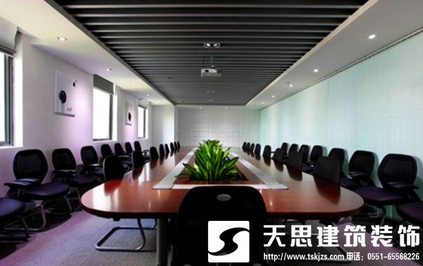 在該800平辦公室裝修項目中,其室內大會議室最具形象,室內有一面形象墻,采用白色logo元素來強調出其簡潔與創意,增加了企業的文化理念的傳播。而在客戶服務區,采用了三個弧形造型辦公位,天花與桌面相互應,三個弧形緊連相接,體現了企業文化的團結一致,服務意識嚴謹。