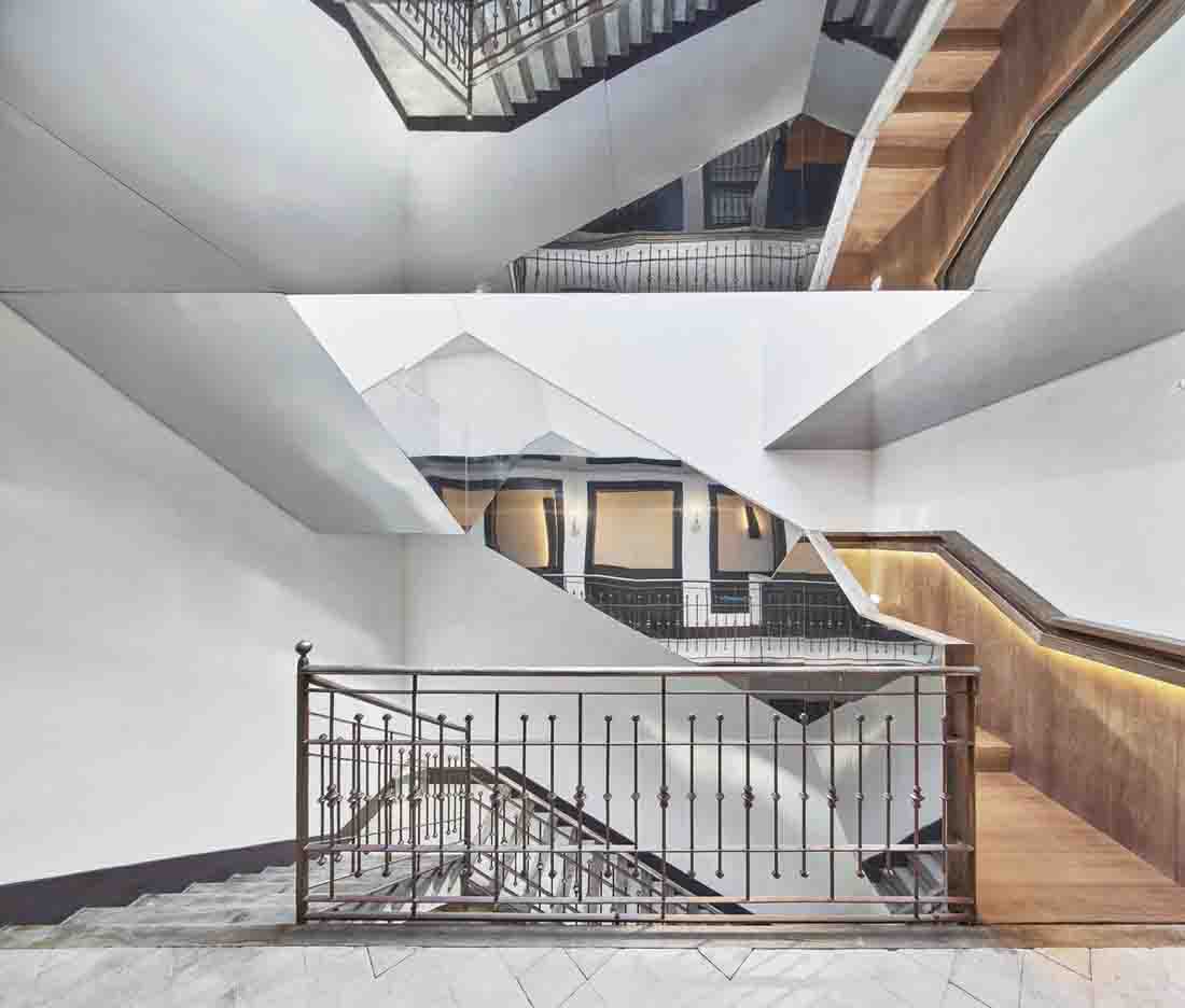 在整個建筑中設計并開發了一系列建筑策略,作為與現有建筑對話的戲劇性和當代特色的干預措施的集合。在底樓,一條綠色的植被走廊侵入餐廳,將花園與庭院和街道連接起來。