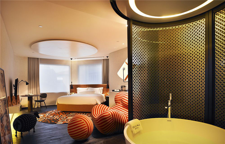 極簡主義風格并沒有妨礙設計師為酒店創造豐富的主題元素,以花草、猴子、孔雀、青蛙等為主題的森林圖案,遍布鏡面、墻壁等區域,營造了精致的“城市森林”效果。