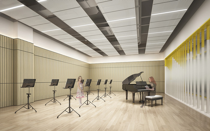 此處藝術(shù)學(xué)校設(shè)計(jì)中,告別了五彩斑斕的顏色,突出了空間的簡潔與干凈,用黃色做為點(diǎn)綴色提升空間的趣味性。